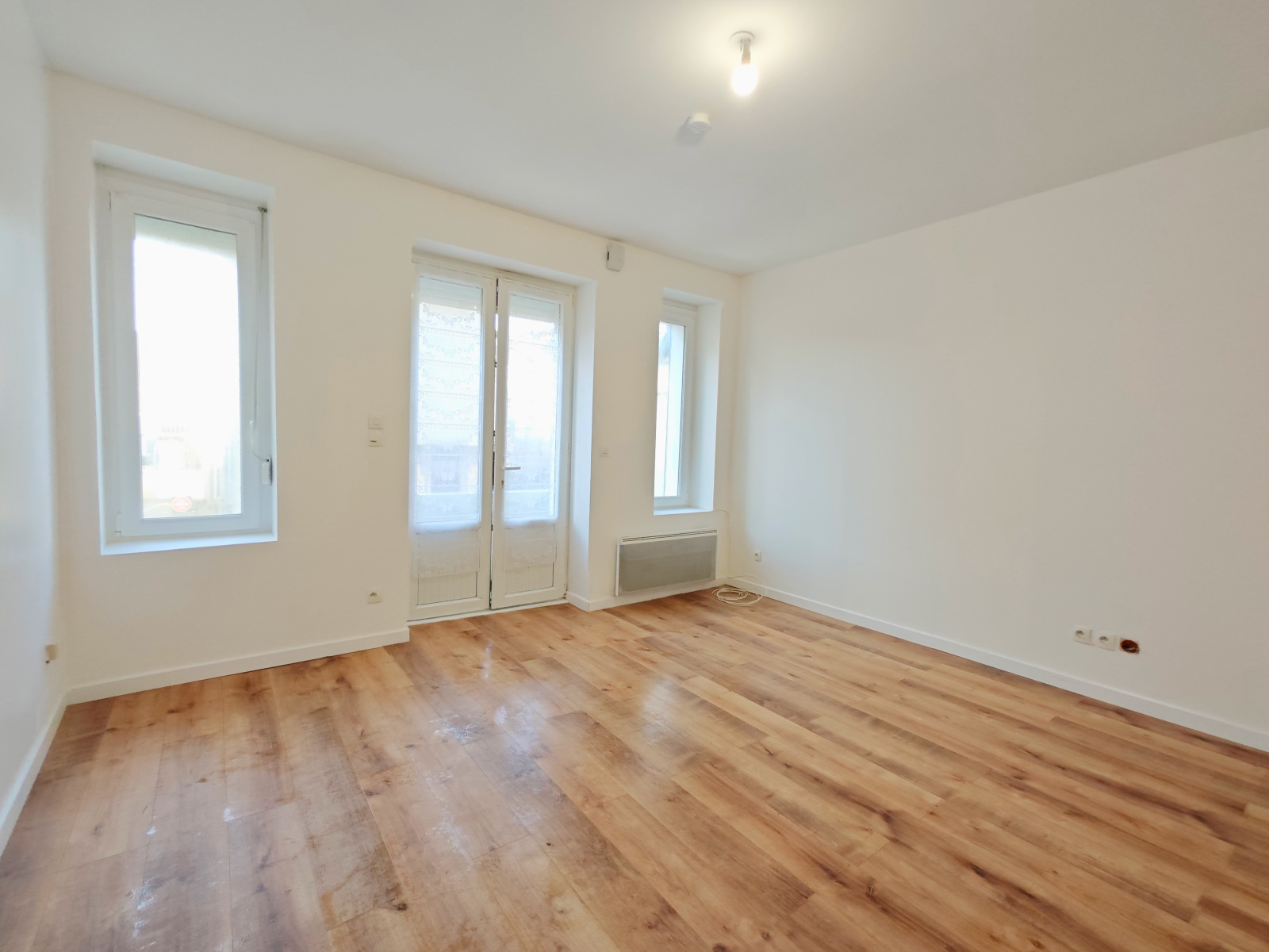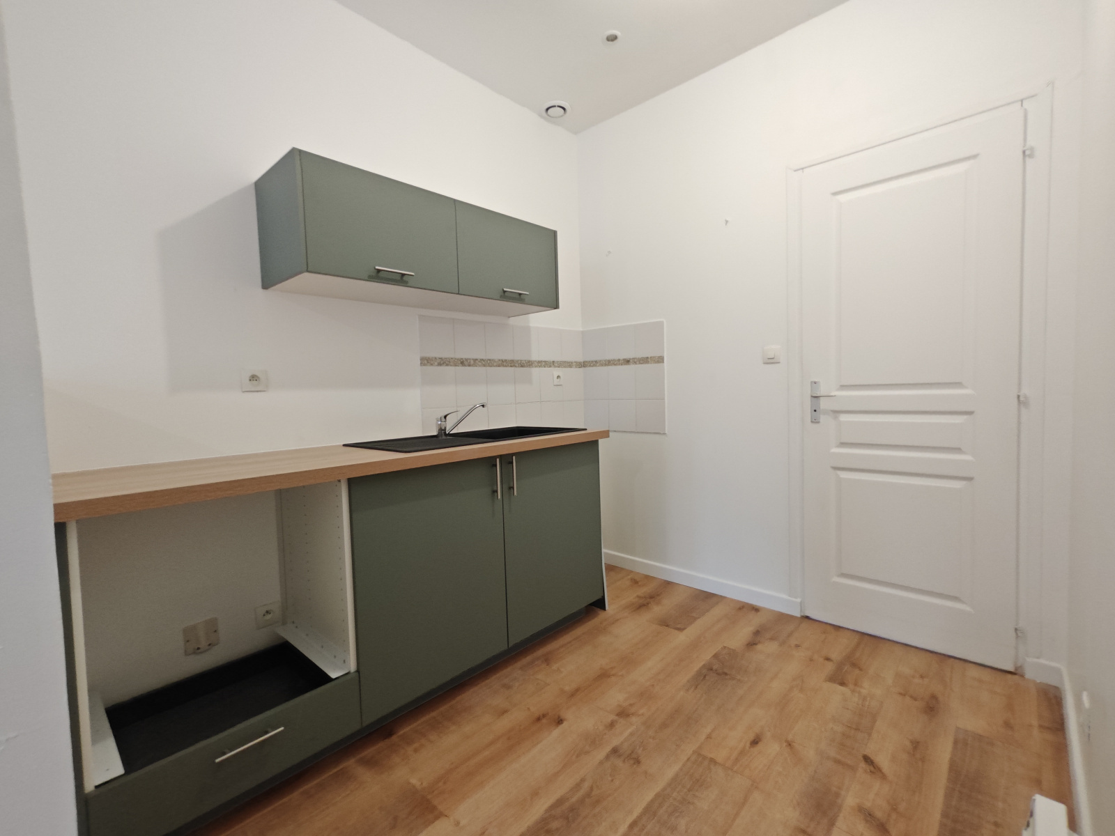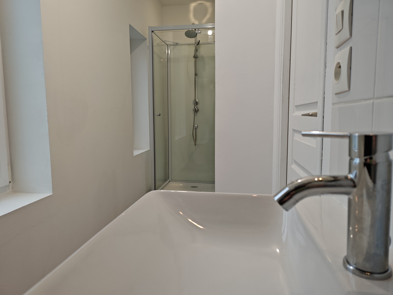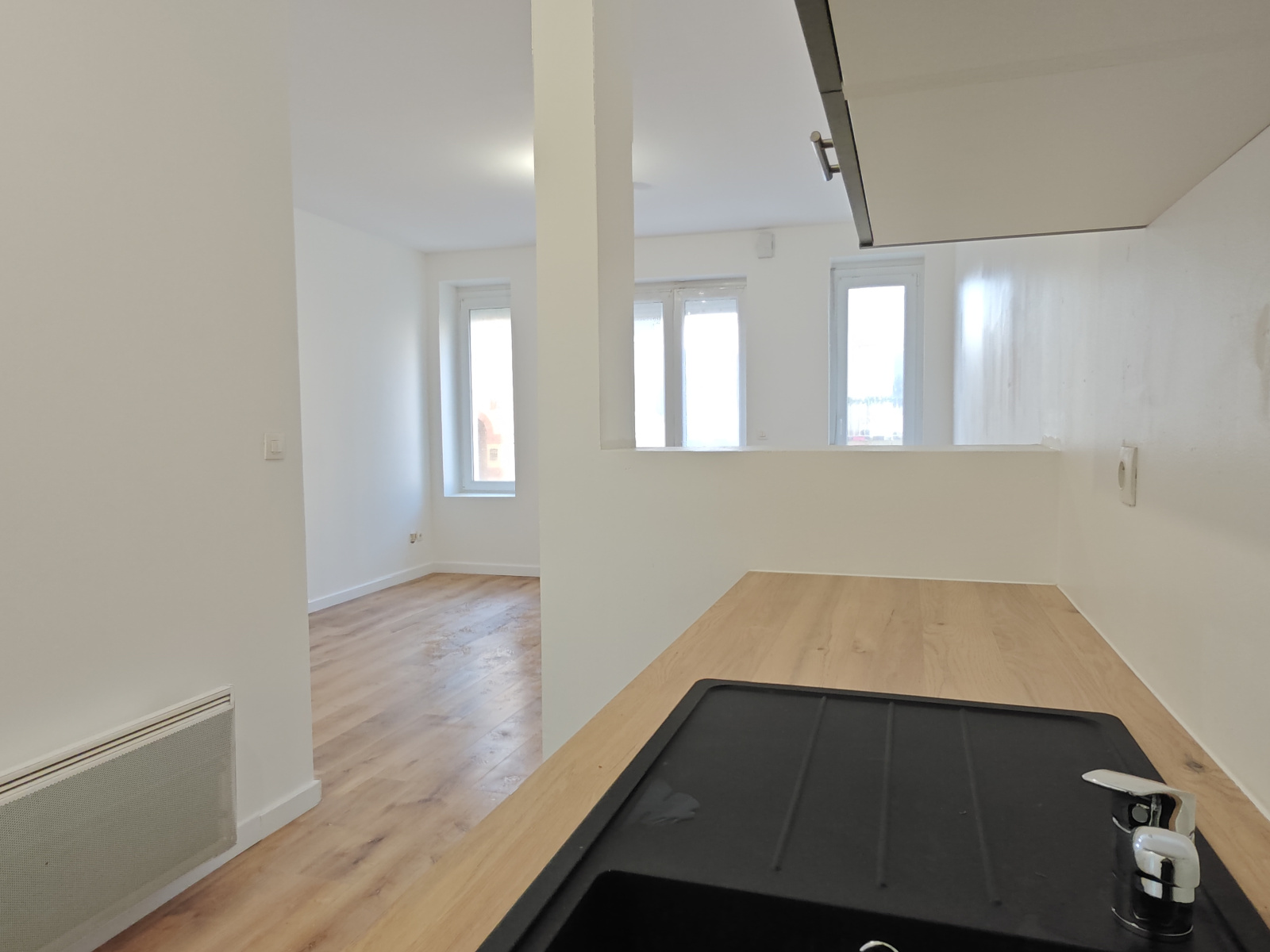 - Une cuisine aménagée ouverte sur une pièce de vie avec un petit balcon et une salle d'eau.